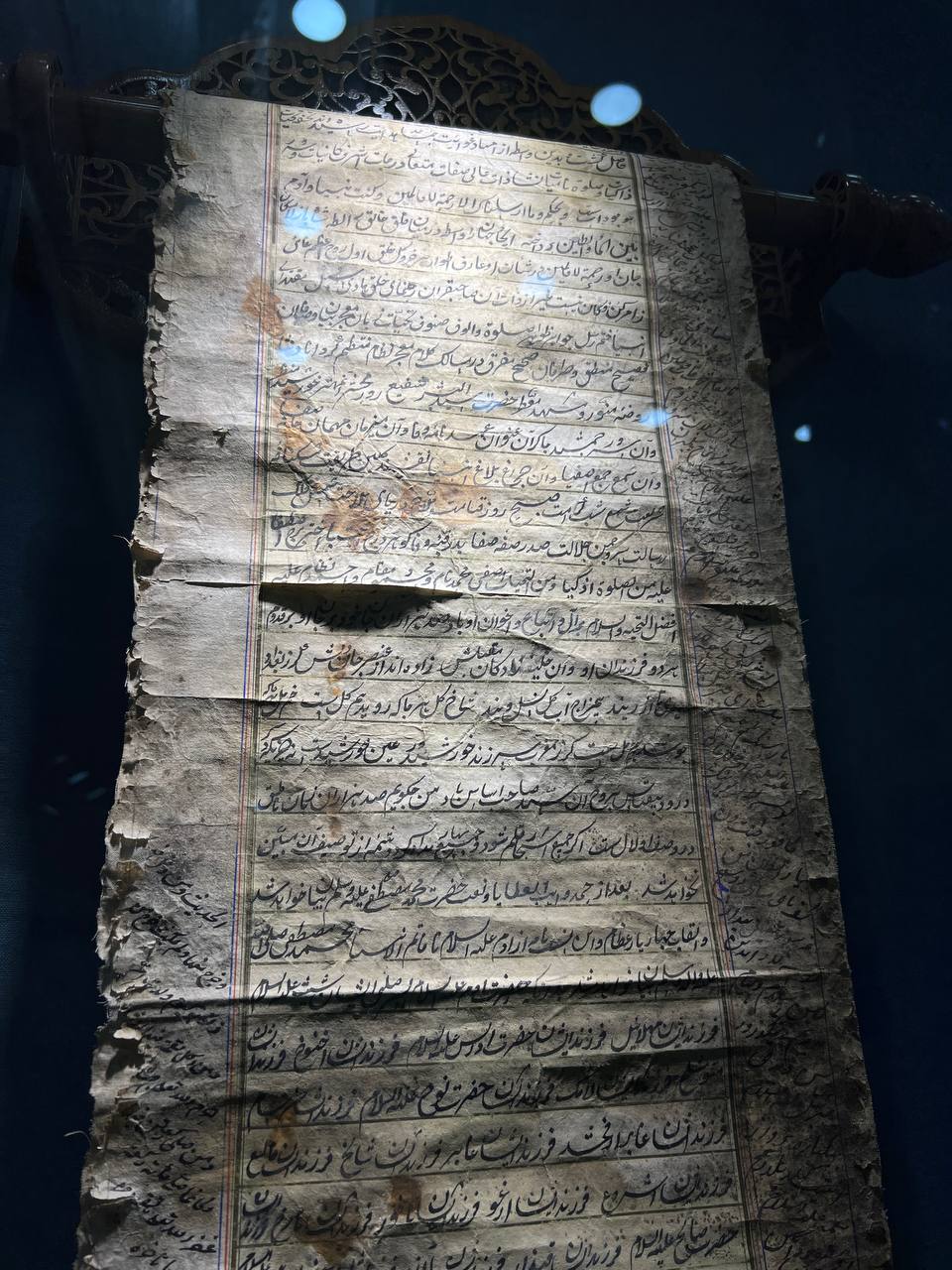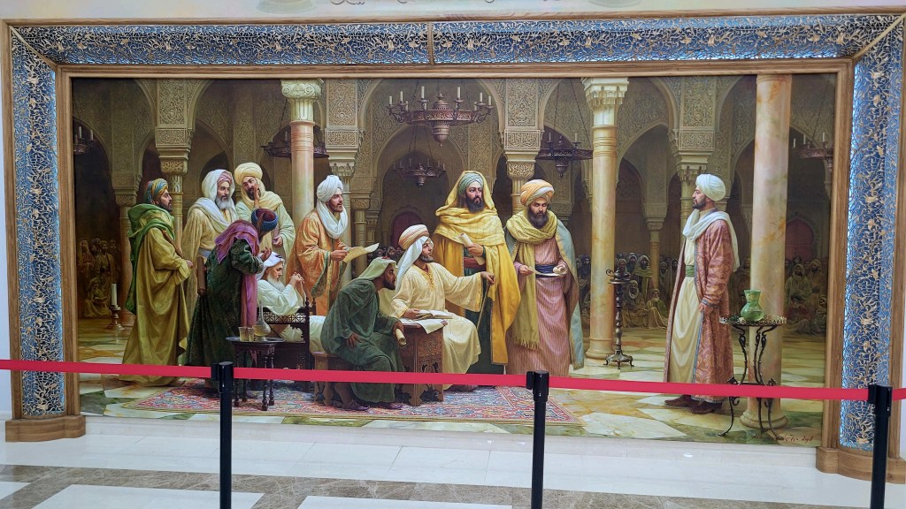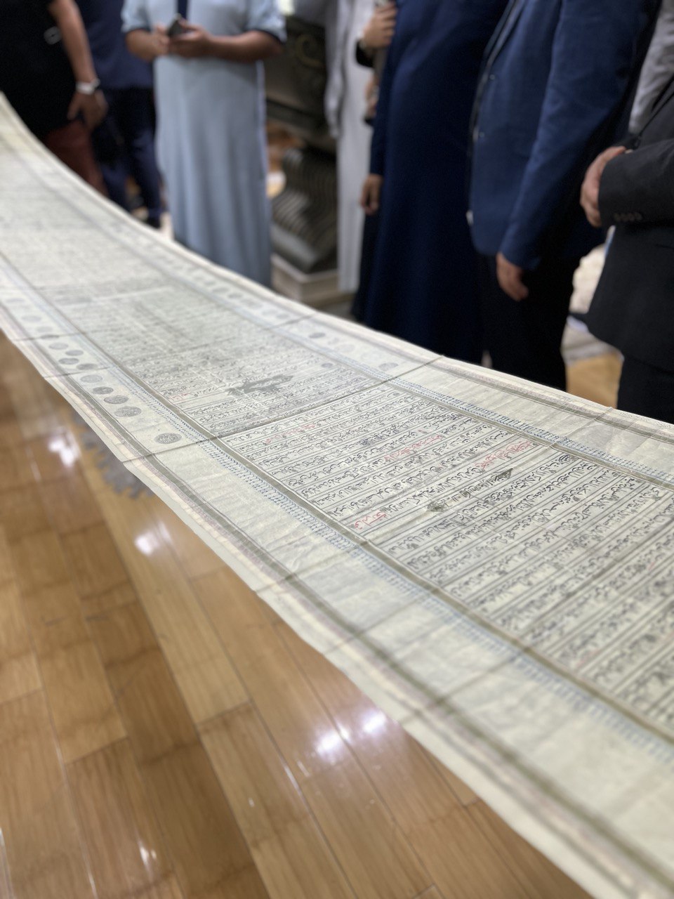We visited the Imam Bukhari International Research Centre, a project commissioned by the president himself. Its mission is to conduct deep research and widely disseminate the rich heritage of the Muslim world, highlighting their invaluable contributions to world civilization and science. The centre also aims to educate the younger generation about the true values of Islam. The centre housed old manuscripts of Ṣaḥīḥ al-Bukhārī and other significant works like ʿUmdat al-Qārī, the commentary of Ṣaḥīḥ al-Bukhārī. They also displayed books the centre had worked on and a long family genealogy scroll in Persian. As I looked closely at the scroll, I noticed the frequent repetition of the word “farzande,” which is the equivalent of “ibn” (son of) in Arabic. One of the most striking features was a huge wall painting depicting the famous event in Baghdad where scholars tested Imam Bukhari’s memory to verify his knowledge of hadith.