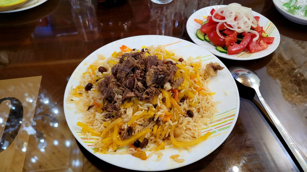 Then, we headed to a nearby restaurant for lunch to eat the traditional rice dish known as ‘plov‘ in Russian or ‘osh‘ in Tajiki. It is very similar to the Afghani qabili palaw but we use bigger rice grains similar to ricotta rice, cut the carrots in shorter pieces, and cube the meat. Most importantly, we use flaxseed oil which makes it taste very different.