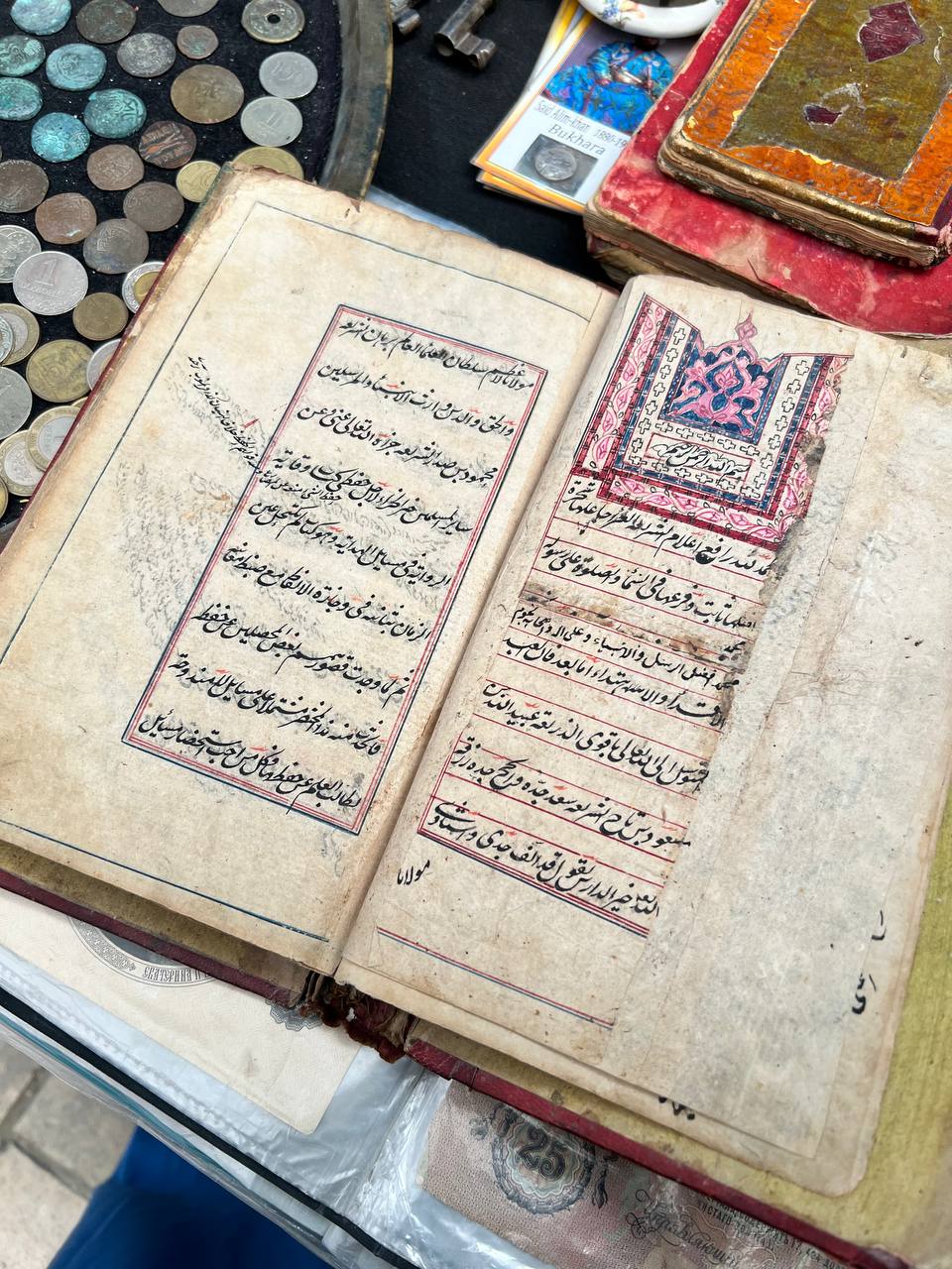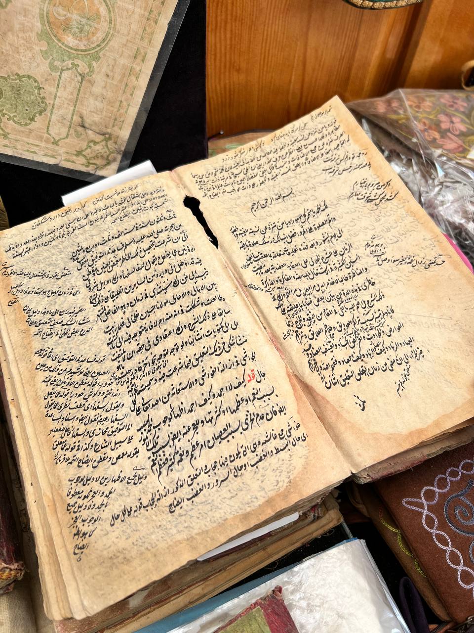 We then went to the Bazaar in Bukhara, where I had the chance to buy some gifts and adras dresses for my mother and sisters. While passing a typical souvenir stall, my eyes fell on what looked like old manuscripts. I opened them and was surprised and impressed to find that these were indeed old manuscripts, casually for sale in a souvenir shop. One was an old Qurʾān manuscript, another was a fiqh manuscript, and another was Persian poetry. My husband noticed them too and we wondered if one might be extremely valuable and worth publishing. He asked for their prices, which ranged from $200 to $800. The price wasn’t the issue, though; it was the legality. Taking manuscripts over 50 years old out of the country is illegal. That was unfortunate, but khayr.