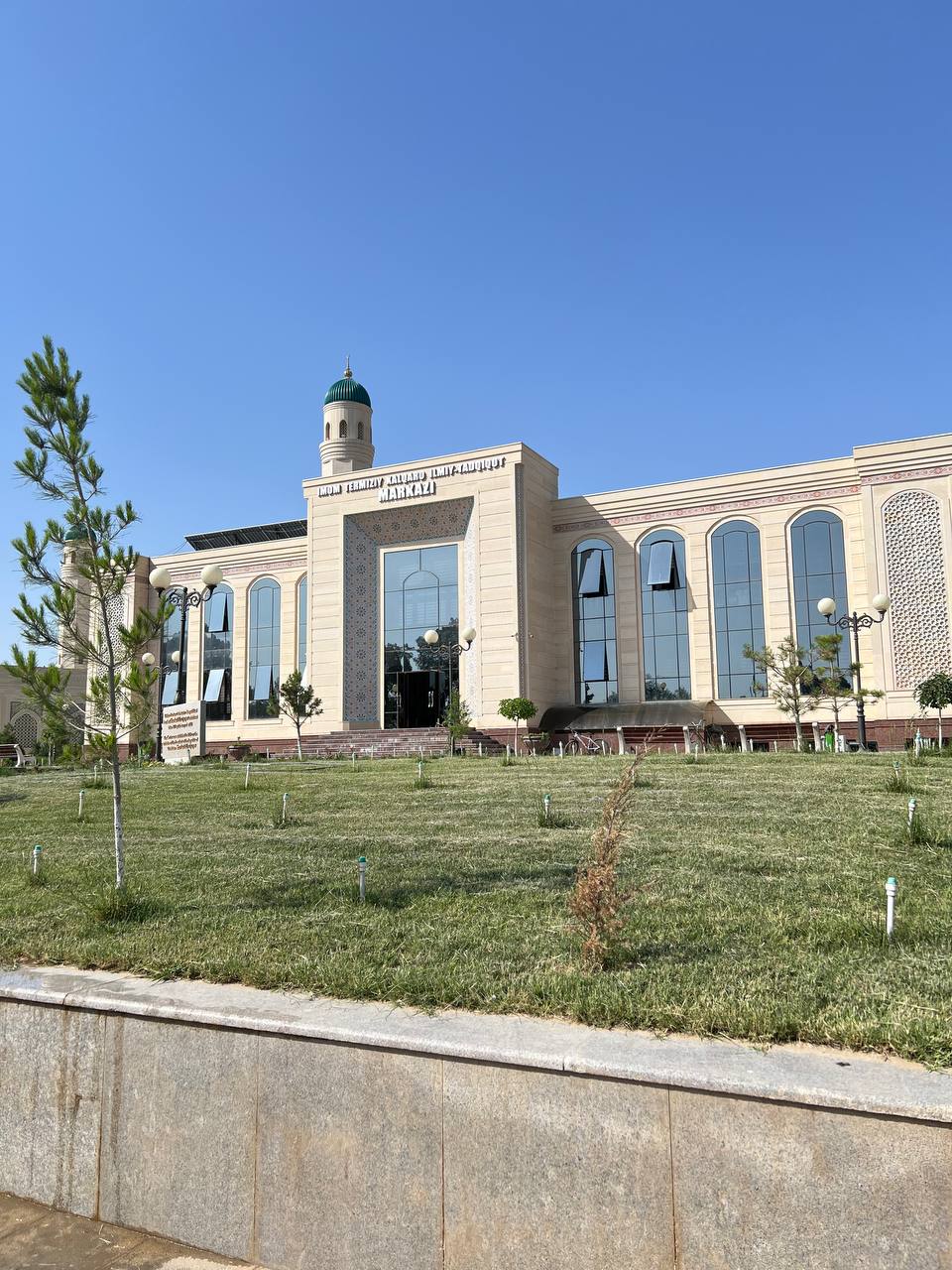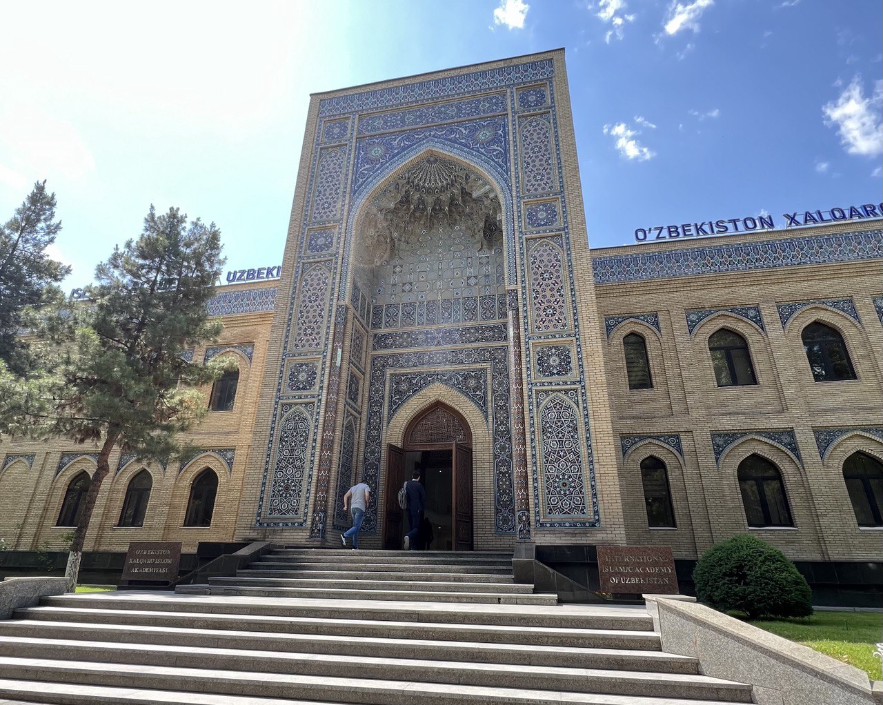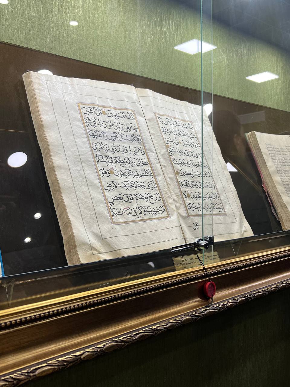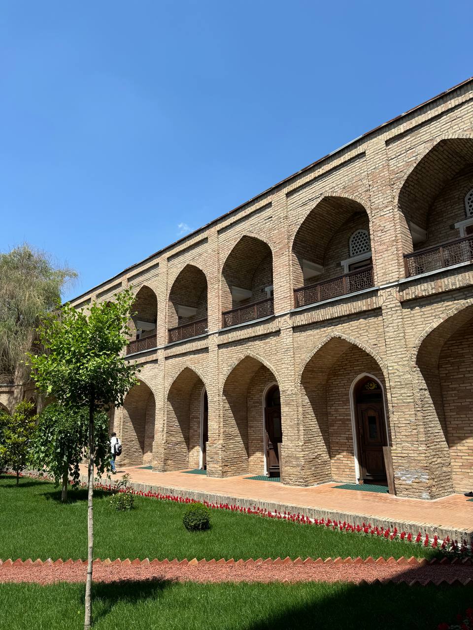 The first day started immediately after a long flight from the UK through Turkey. Nostalgia washed over me as I saw the streets of Tashkent adorned with flower-patterned grass fields and tree trunks painted white halfway up. We waited for everyone to gather outside the airport before boarding the coach and beginning our trip. Our first stop was the O’zbekiston Xalqaro Islom Akademiyasi (The International Islamic Academy of Uzbekistan), a higher educational institution founded in 2018. This institution has several departments, one of the main ones being the Manuscript Depository. During the Soviet Union, religion was persecuted, so out of fear, people would hide these manuscripts by burying them and storing them in the walls of their houses. Since gaining independence in 1991, the government been working on gathering these manuscripts into their museums. The Department researches, publishes, catalogues, and reintroduces unique manuscripts. At present, the repository has about 500 manuscripts, almost 1500 lithographic editions, and over 10,000 modern books. The department carefully preserves a replica of the Qurʾān copy of ʿUthmān produced by an Uzbeki calligraphist (different to the one in the Mo’yi Moborak masjid), as well as manuscripts containing historical information on Sufism, Mantiq, Balagha, mathematics, astronomy, geometry, medicine, and natural sciences.