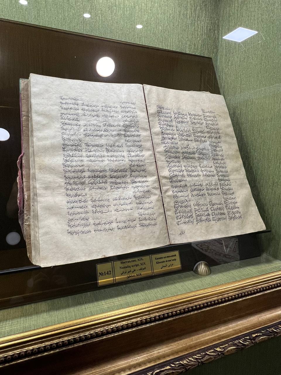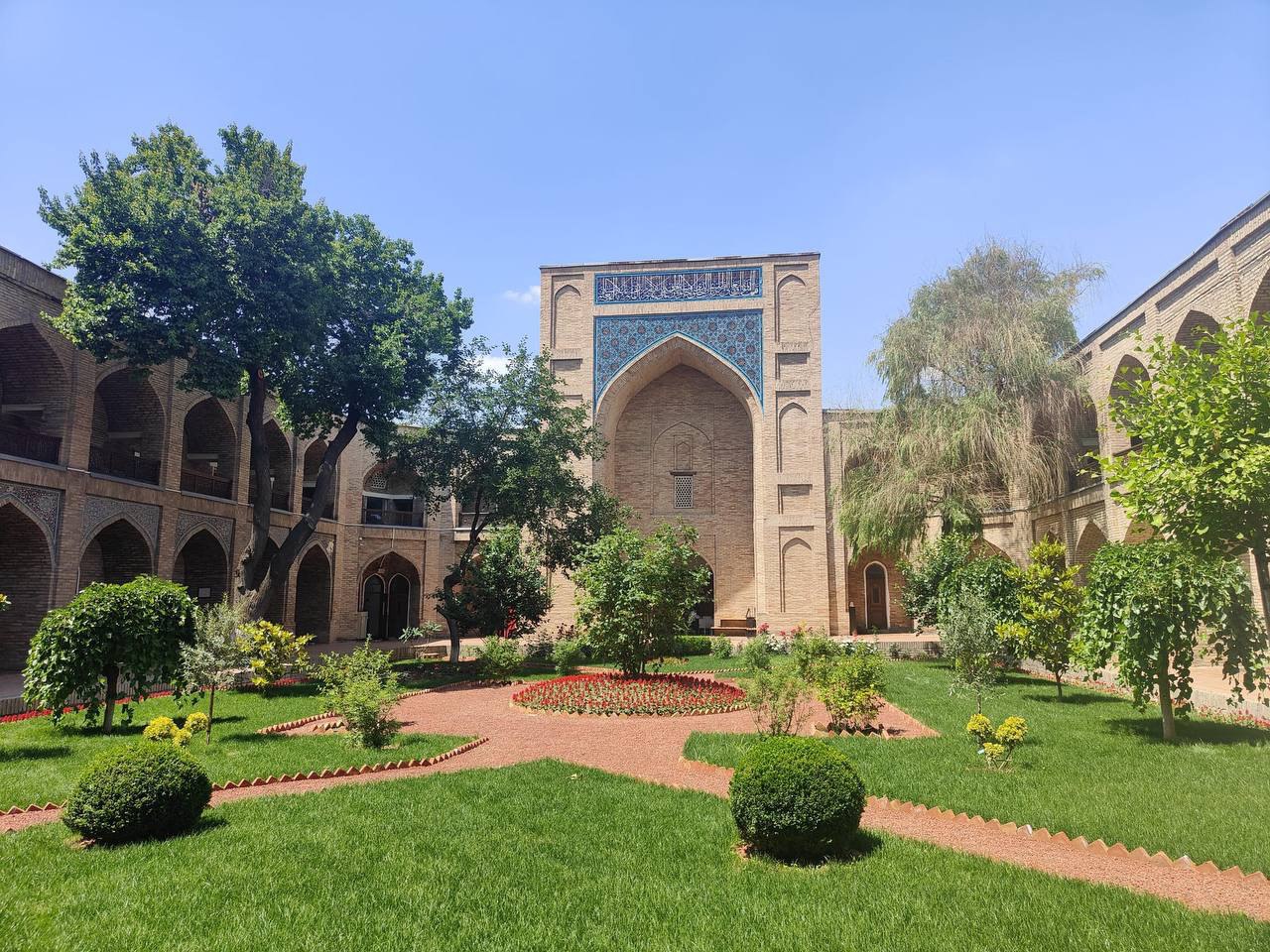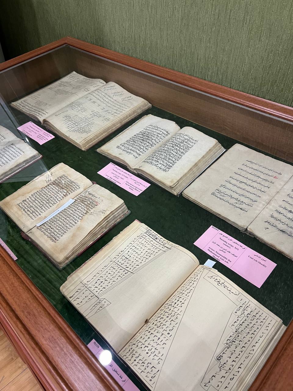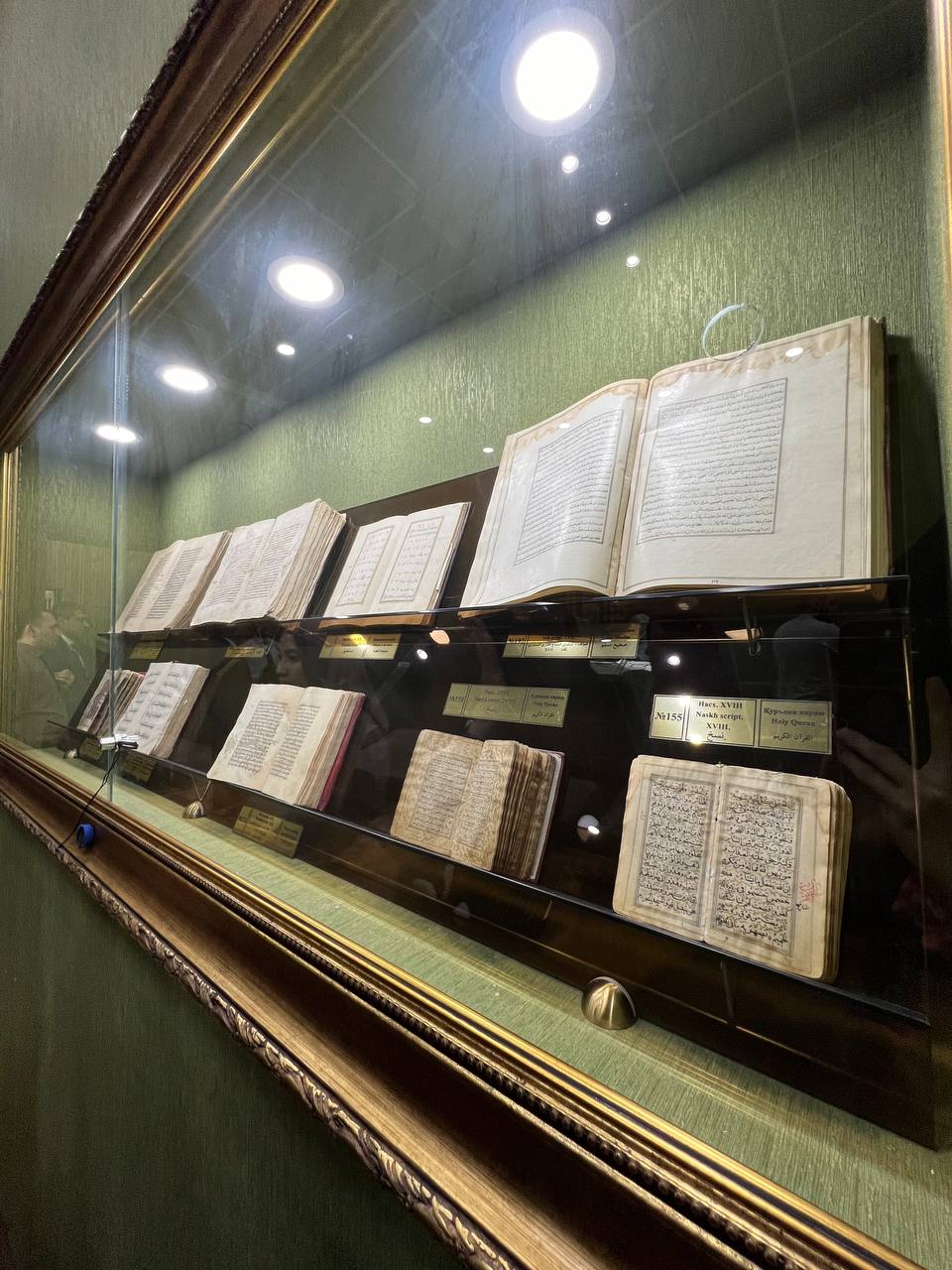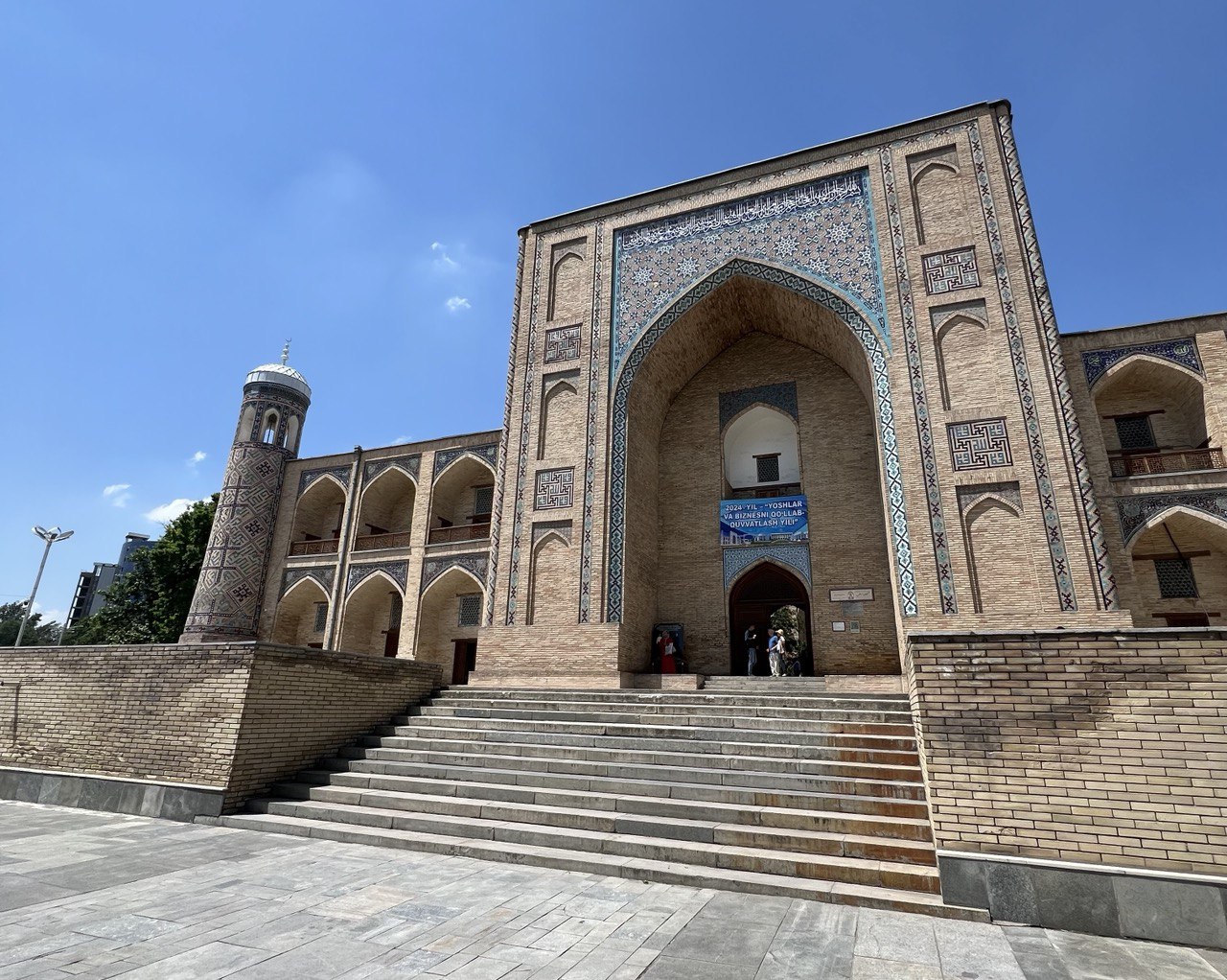 The first day started immediately after a long flight from the UK through Turkey. Nostalgia washed over me as I saw the streets of Tashkent adorned with flower-patterned grass fields and tree trunks painted white halfway up. We waited for everyone to gather outside the airport before boarding the coach and beginning our trip. Our first stop was the O’zbekiston Xalqaro Islom Akademiyasi (The International Islamic Academy of Uzbekistan), a higher educational institution founded in 2018. This institution has several departments, one of the main ones being the Manuscript Depository. During the Soviet Union, religion was persecuted, so out of fear, people would hide these manuscripts by burying them and storing them in the walls of their houses. Since gaining independence in 1991, the government been working on gathering these manuscripts into their museums. The Department researches, publishes, catalogues, and reintroduces unique manuscripts. At present, the repository has about 500 manuscripts, almost 1500 lithographic editions, and over 10,000 modern books. The department carefully preserves a replica of the Qurʾān copy of ʿUthmān produced by an Uzbeki calligraphist (different to the one in the Mo’yi Moborak masjid), as well as manuscripts containing historical information on Sufism, Mantiq, Balagha, mathematics, astronomy, geometry, medicine, and natural sciences.
