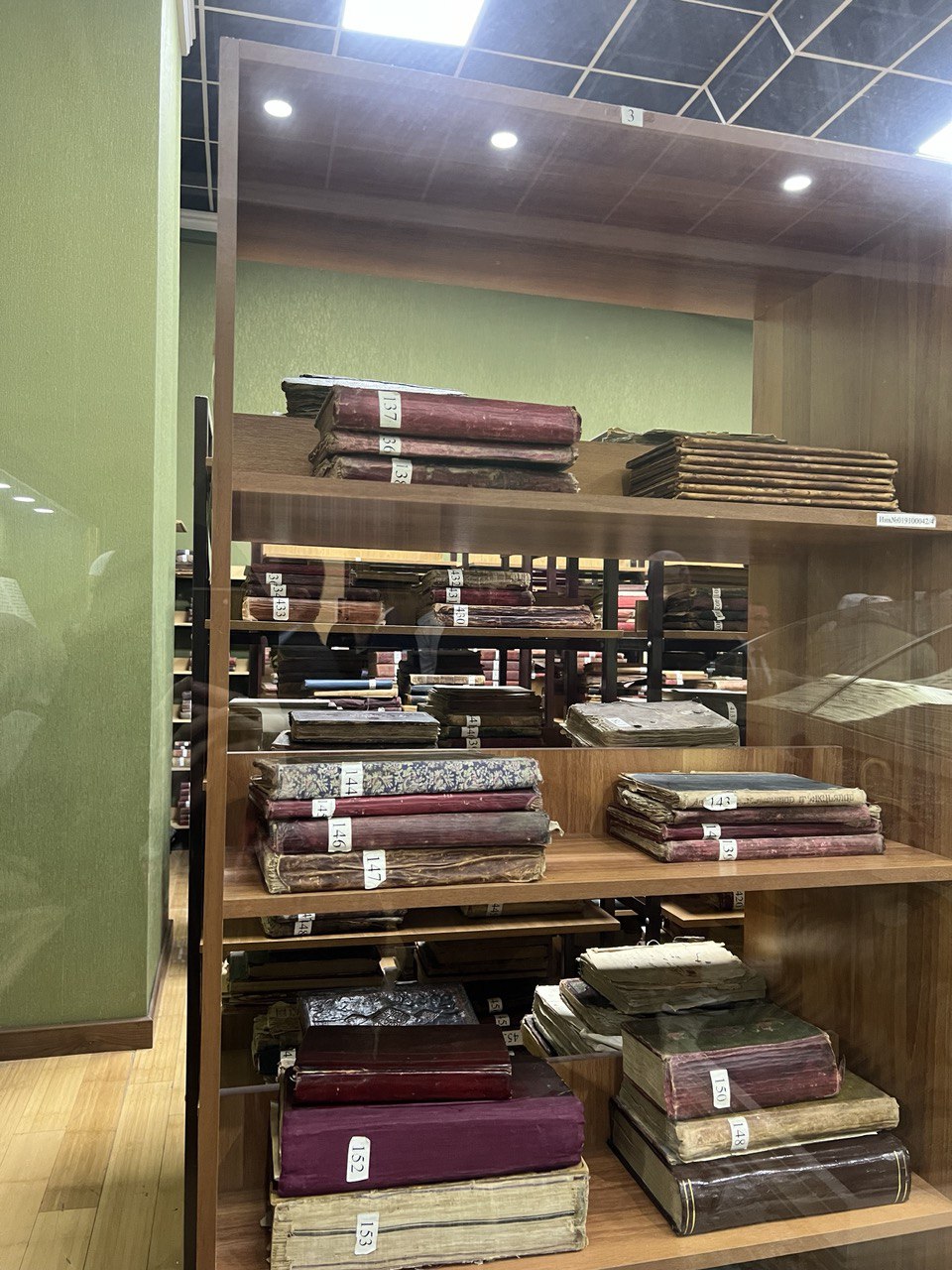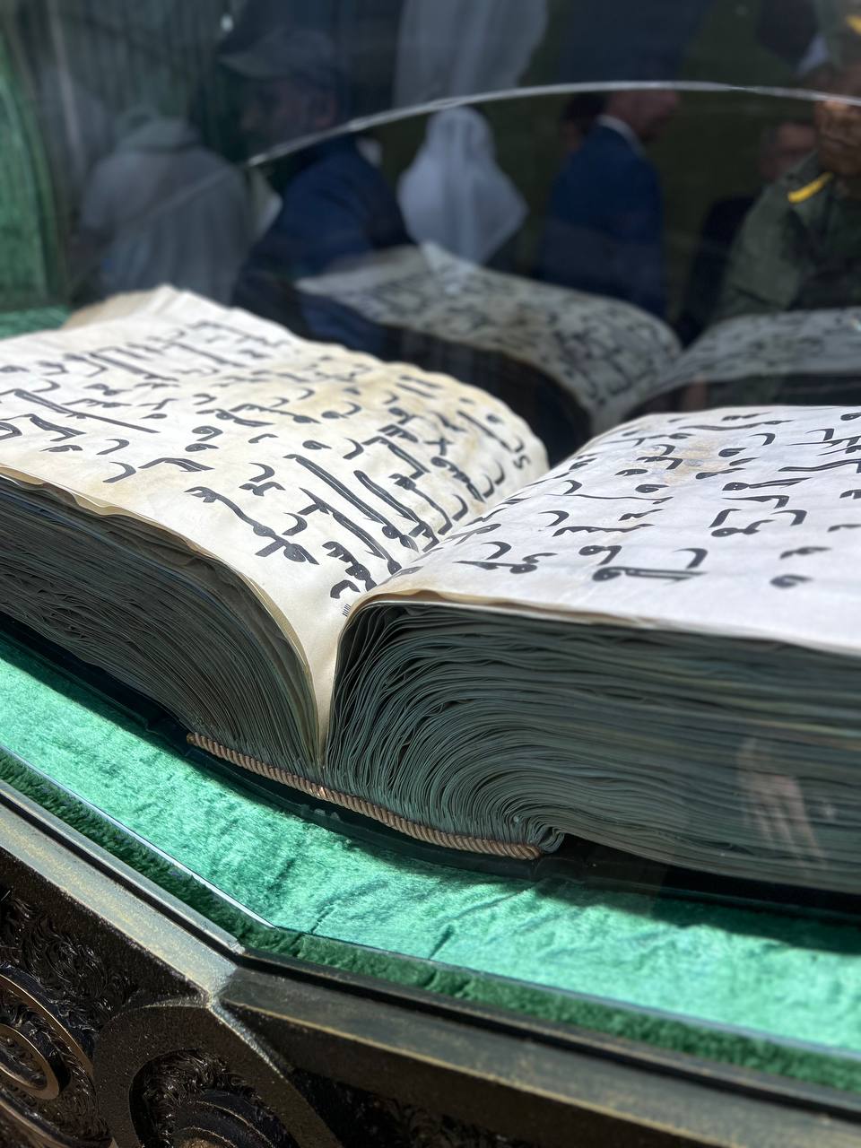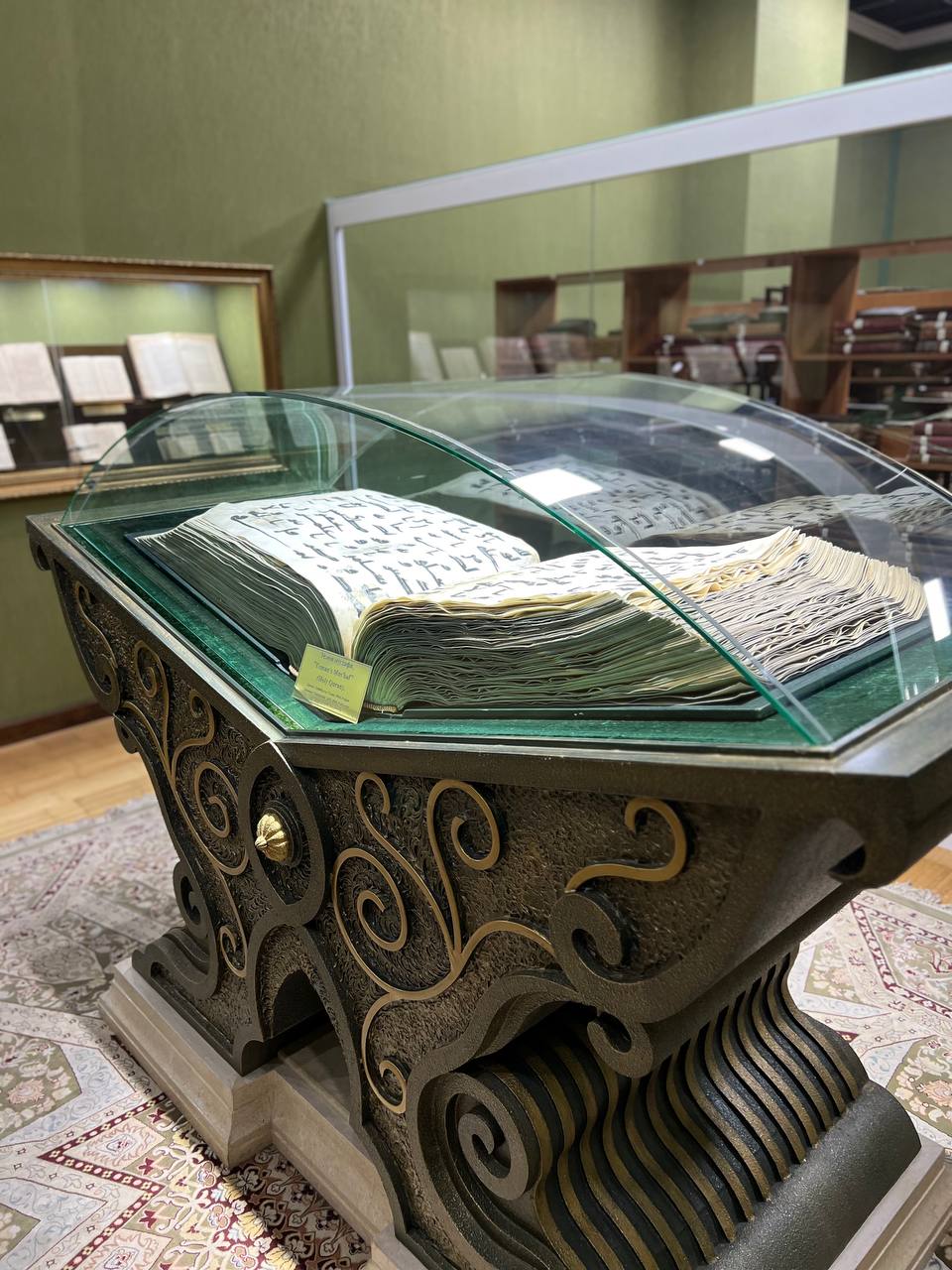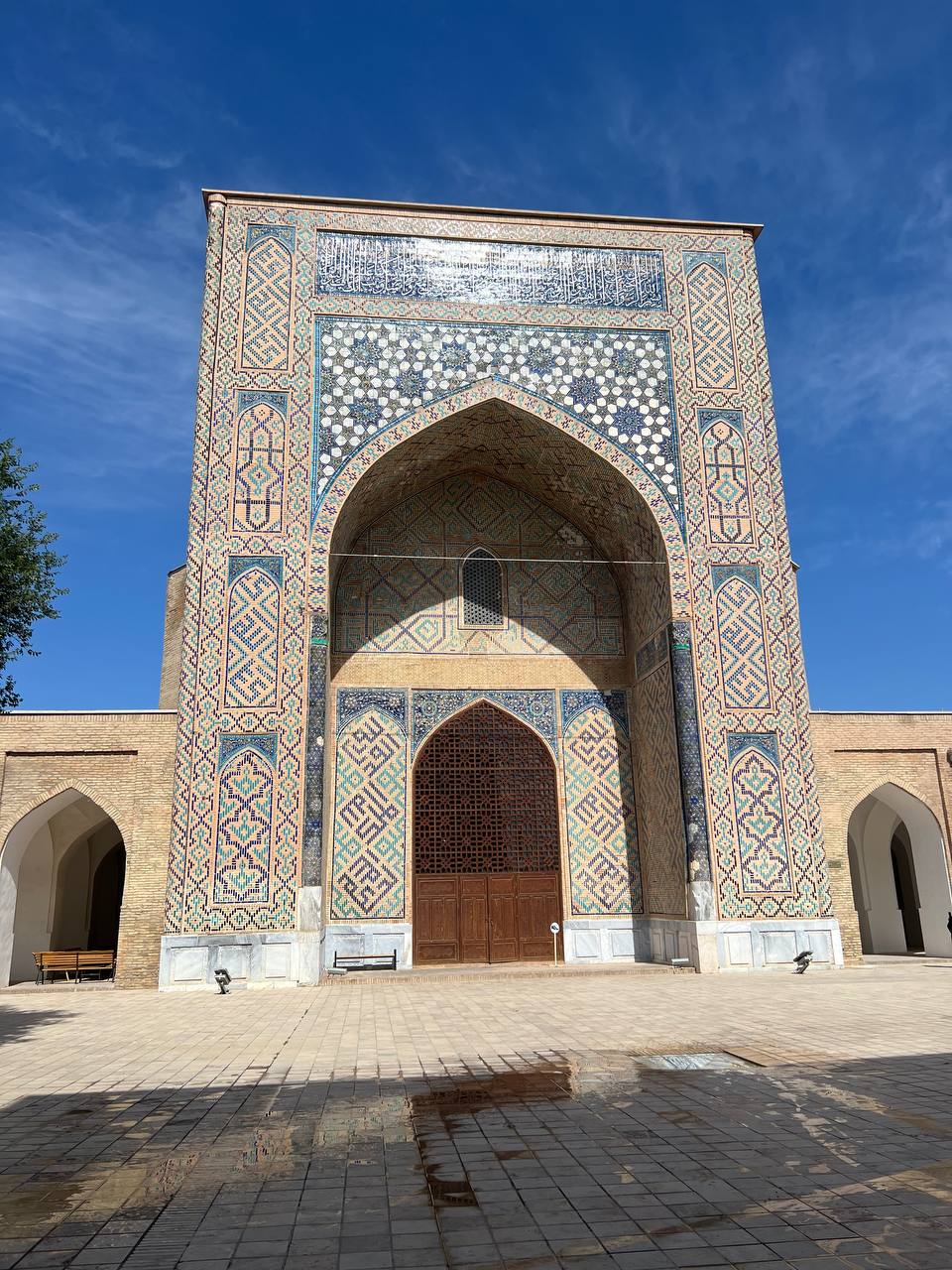The first day started immediately after a long flight from the UK through Turkey. Nostalgia washed over me as I saw the streets of Tashkent adorned with flower-patterned grass fields and tree trunks painted white halfway up. We waited for everyone to gather outside the airport before boarding the coach and beginning our trip. Our first stop was the O’zbekiston Xalqaro Islom Akademiyasi (The International Islamic Academy of Uzbekistan), a higher educational institution founded in 2018. This institution has several departments, one of the main ones being the Manuscript Depository. During the Soviet Union, religion was persecuted, so out of fear, people would hide these manuscripts by burying them and storing them in the walls of their houses. Since gaining independence in 1991, the government been working on gathering these manuscripts into their museums. The Department researches, publishes, catalogues, and reintroduces unique manuscripts. At present, the repository has about 500 manuscripts, almost 1500 lithographic editions, and over 10,000 modern books. The department carefully preserves a replica of the Qurʾān copy of ʿUthmān produced by an Uzbeki calligraphist (different to the one in the Mo’yi Moborak masjid), as well as manuscripts containing historical information on Sufism, Mantiq, Balagha, mathematics, astronomy, geometry, medicine, and natural sciences.