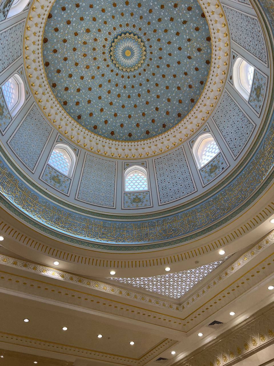 Following that, we entered the Mo’yi Muborak Madrasa building, which houses one of the four ancient copies of Muṣḥaf ʿUthmānī, which was written in Hijazi script on deer skin during the caliphate of ʿUthmān (raḍiy Allāhu ʿanh). This copy is considered one of the rarest manuscripts and was brought from Syria by Amir Temur in the 14th century. There were poles around the glass cover where the copy was placed with a sign that prohibited taking pictures. At some point during the 17th century CE, it was converted into a madrasa for students, but today, it serves as a library. It contains more than 20,000 manuscripts, lithographs of spiritual content, translations of the Qurʾān in more than 30 languages, and other books and manuscripts. What stood out for me was why this building was called ‘Mo’yi Muborak’. It is believed that a hair strand of the Messenger of Allah (ﷺ) is buried in between one of the bricks in the building. However, the location of the hair strand has been kept hidden so that no one attempts to steal it for themselves. After this, we prayed in the Hazrati Imom Masjid, which had the most breathtaking interior.