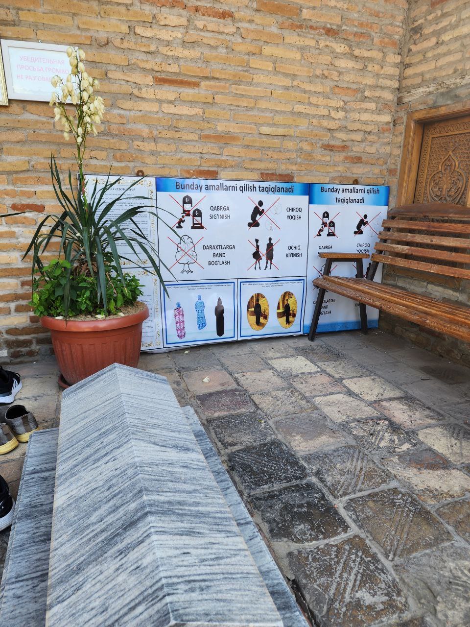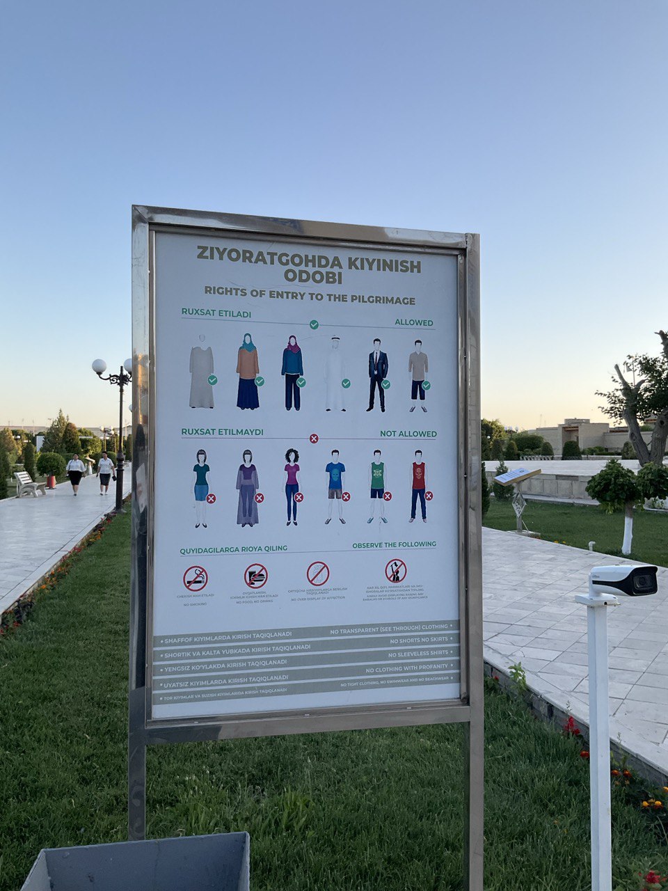 I also reflected on the beautiful and magnificent mausoleum built over Imam Tirmidhī’s grave. The Messenger of Allah (ﷺ) instructed that graves should not be adorned or turned into monuments. So, how does the Government of Uzbekistan justify this? It’s true that they do it to honour scholars and saints, but what about the laypeople who might mistakenly believe that these deceased figures can grant them favours? At every gravesite we visited, I saw many women who would enter, sit, or make duʿā, then leave. Many of these women didn’t seem particularly religious, as they would only cover their hair and any exposed areas before entering. Although this was the case, interestingly, I did often see two types of signposts at the entrance of many complexes and mausoleums: one illustrating how both genders must dress modestly, and another prohibiting activities like grave worshipping, typing knots on trees, lighting lights, immodesty, etc.