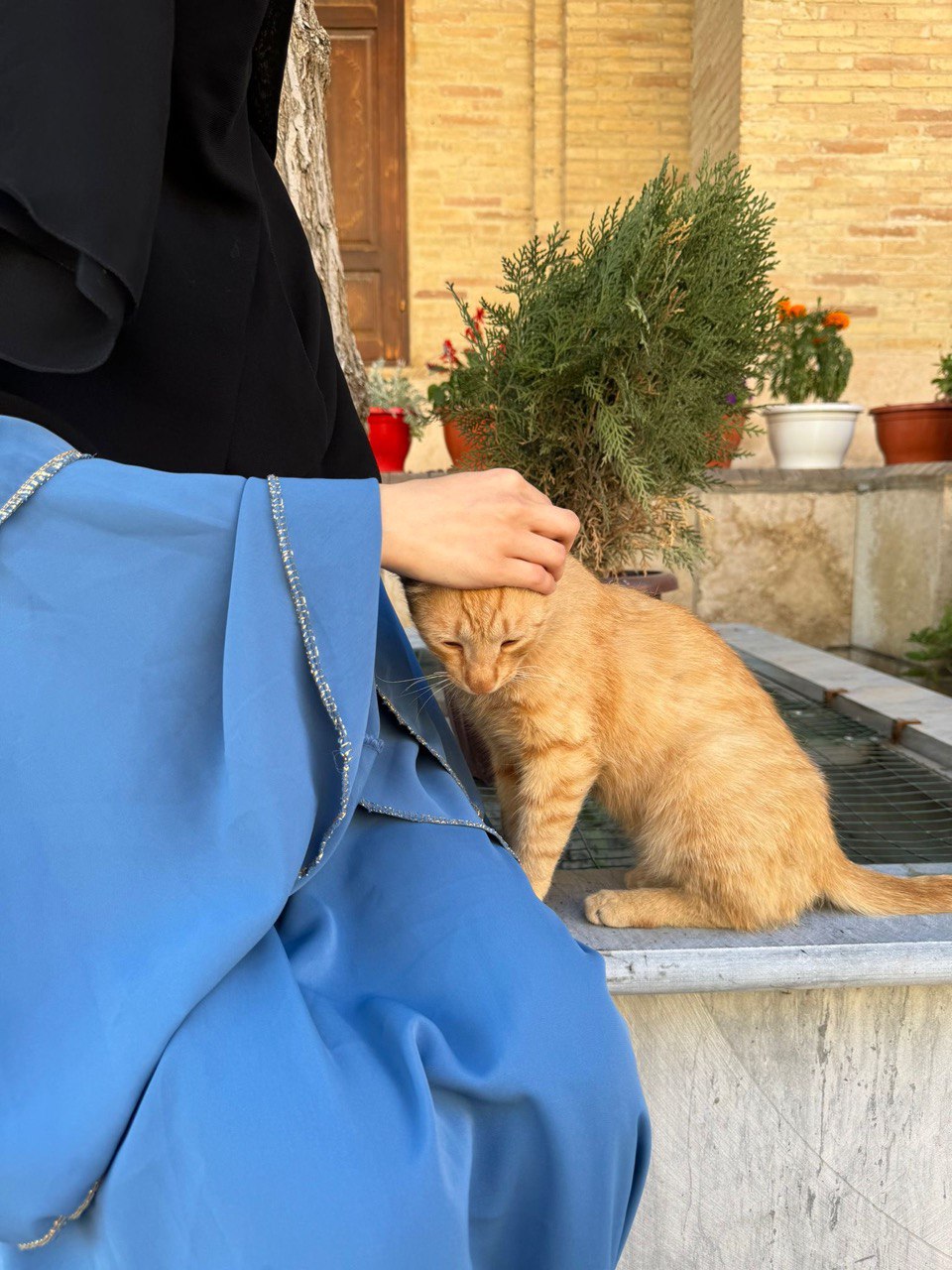 Feeling tired, I sat by the silk carpet shop where everyone was browsing. While I sat, an orange cat—whose tail had been slightly but constantly tugged by a little girl earlier—slowly made its way into my lap. It seemed less than a year old and reminded me of my fluffy white Ragdoll named ‘Shayba’ back in Canada.
